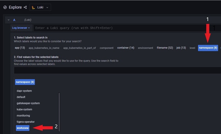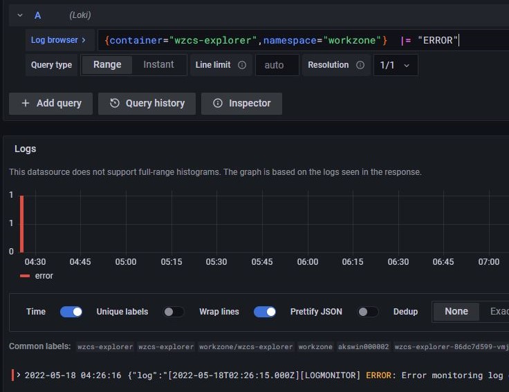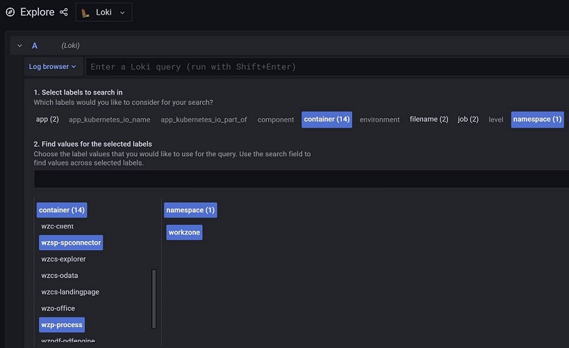Log browser for each environment will be available at https://<ENVIRONMENT_URL>/grafana/explore (for example, https://cat-aks.test.workzone.cloud/grafana/explore for CAT-AKS).