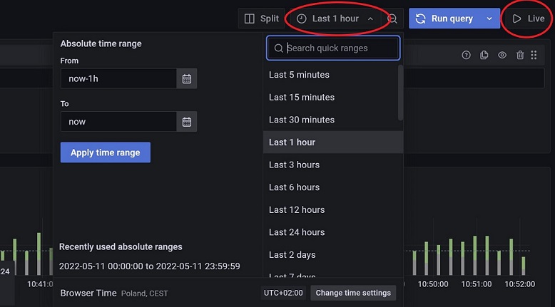 - After you have selected all options, click Show Logs to see the logs. You can specify the requested time range in the upper-right corner, or set it as Live with auto-refresh.