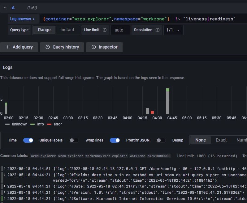 To use the monitoring tools for WorkZone, see Monitoring using Grafana and Loki.
