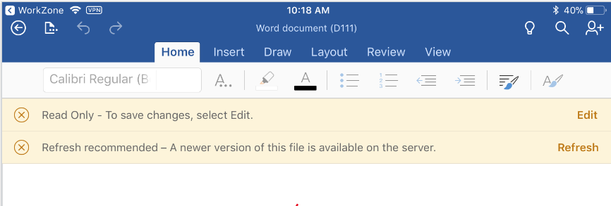 The following messages may appear at the top of the screen in Office 365 when you open documents for editing from WorkZone Mobile (Legacy). Click relevant message below to get additional information about the message and how to continue.