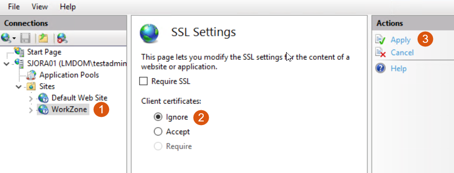 - Find WorkZone under Sites and select Ignore Client certificates.
