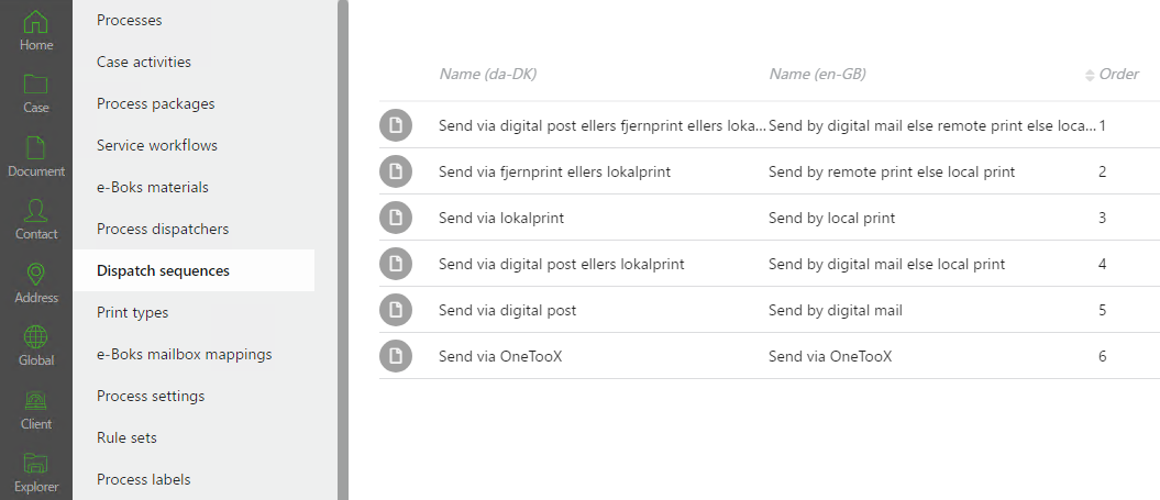 next to the dispatch sequence that you want to use, for example, Send by digital mail else remote print else local print, and click Edit. Change the values so that they match your organization, for example, change the names you want to display to the users in the Localize name fields and the order in the Order field.