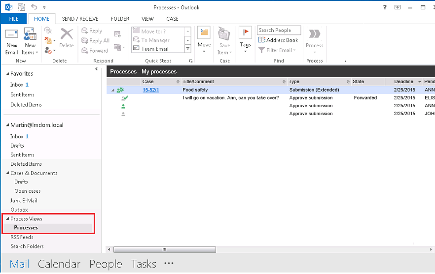 Processes and data are easy to manage in the Processes overview in the Process Views folder which is located in the Outlook navigation pane.