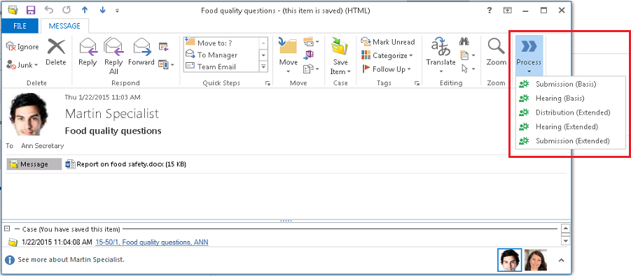 Work with processes such as hearings, submissions, and distributions directly from Outlook. For example, when you receive a document in an email, you can create or save on a case and start a process directly from Outlook. The parties that you invite to provide feedback or take ownership of the case will receive tasks via emails and you and the other parties will get email notifications to remind you about due dates.