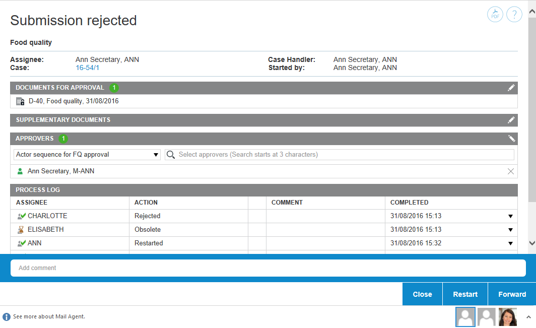 - Click Forward to forward the task to another person or organizational unit who should then decide if the process should be closed.
