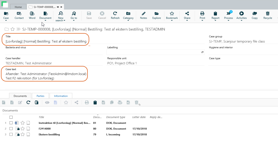 - The case title and phase process title is updated. The text in the square brackets in the title is changed according to what is defined in F2, for example [Ministersvar på henvendelse (Minister reply to requisition)] Bestilling: Test af ekstern bestilling.