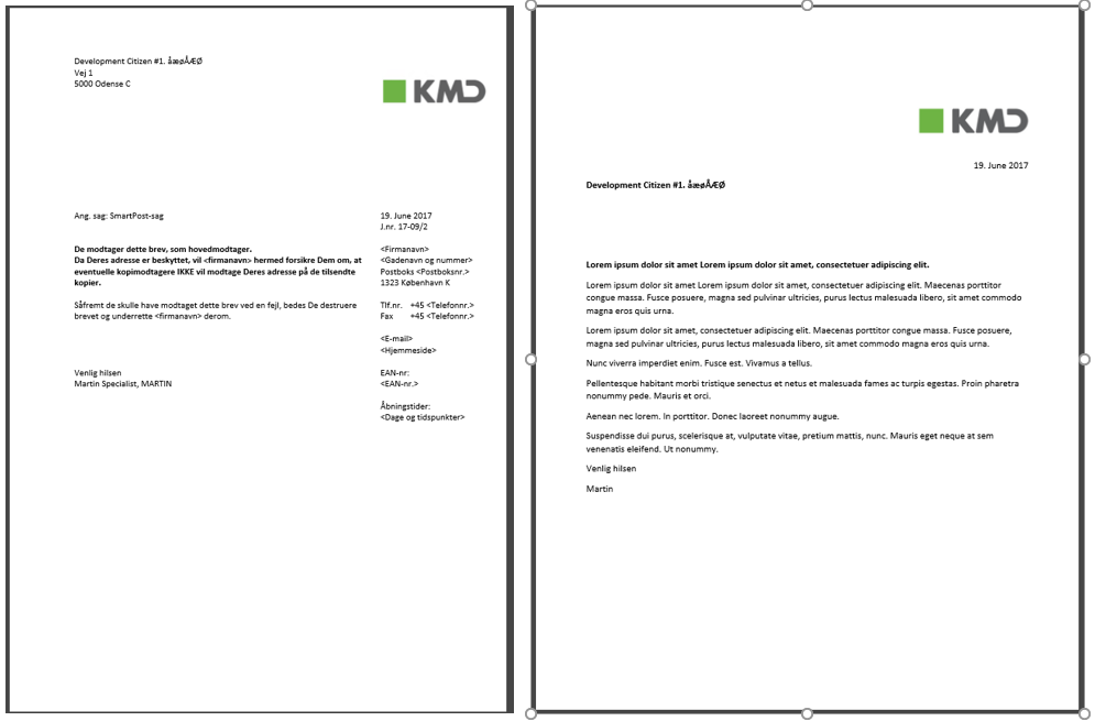 When a SmartPost process is started, the SmartPost messages are created on the basis of the selected letter document and attachments. The messages are created by merging data on the selected case with contact data on the recipients and copy recipients into a PDF document which contains both the letter and attachments, which is included in the messages as the main letter. If you send a message to Digital Post or by email, you can also choose to send attachments as separate PDF documents in the message.
