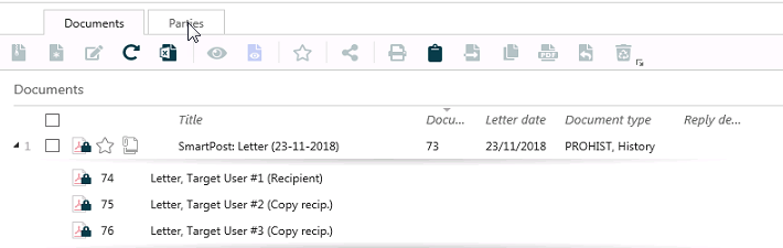 When you have selected a letter, the parties with the role Copy recipient on the selected letter are added automatically to the list of copy recipients. You can remove these recipients and replace them with other recipients.