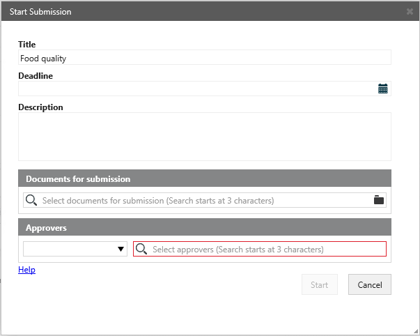 - In theStart Submission dialog, the case title is automatically inserted in the Title field.