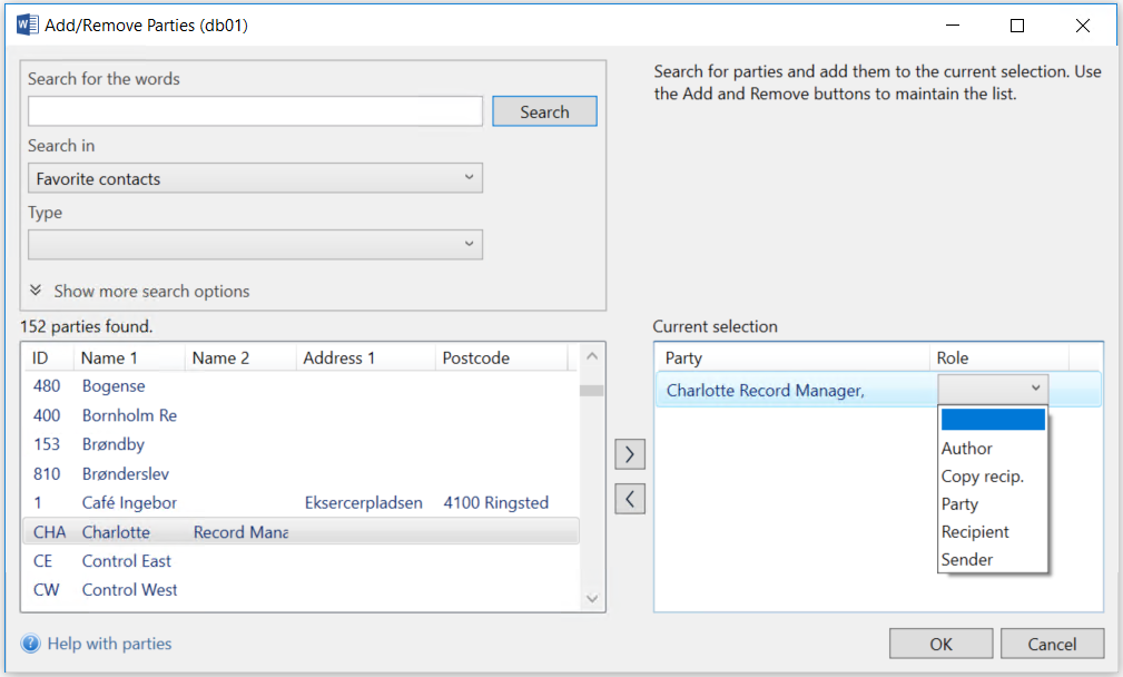 In the Document Parties pane, click the Add/Remove button.