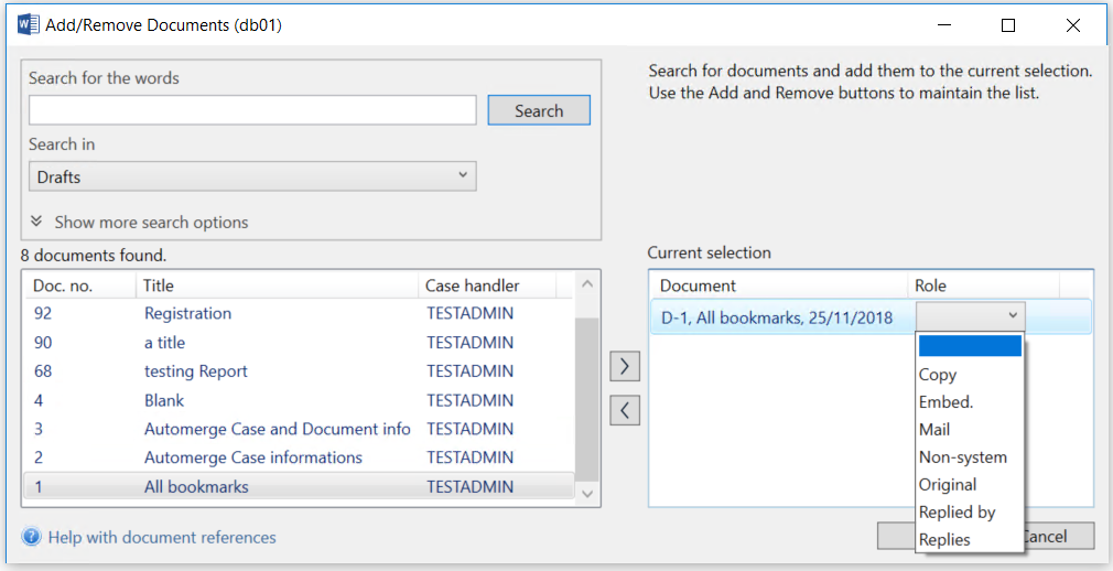 Repeat this step for each document you want to add. - If necessary, specify roles for the documents.