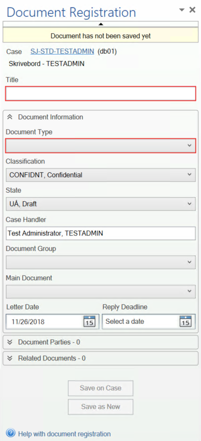 You can register a document by using the Document Registration pane. To do this, fulfill the needed fields and click Save on Case.