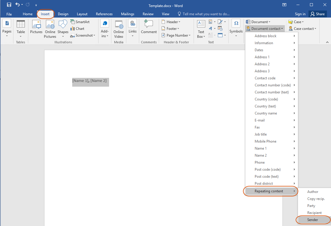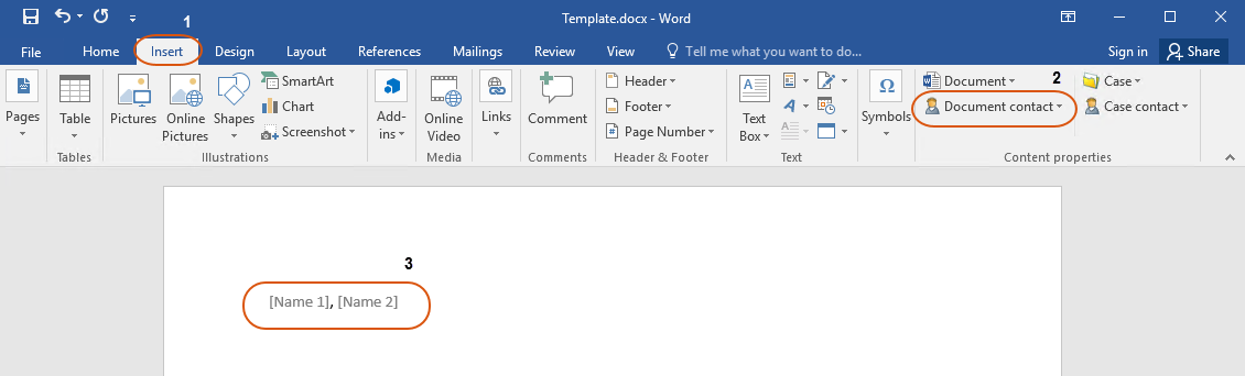 On the Insert tab, in the Content properties group, click the content control from the relevant group, and select a property you want to insert. For example, if you want to insert names of all parties with the Sender role, you must add content controls Name 1 and Name 2 with the Sender role.