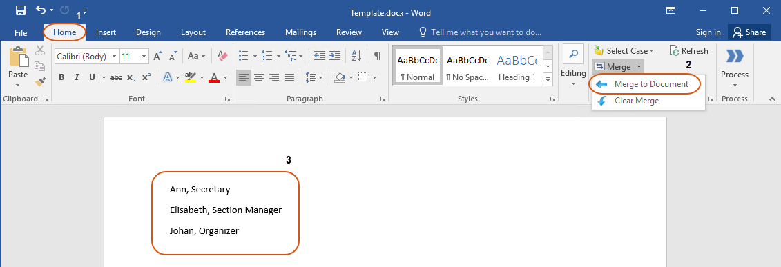 - On the Home tab, click Merge > Merge To Document.