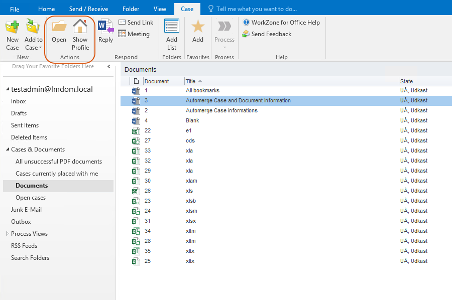 In the case or document overview in Microsoft Outlook, you can open a document in, for example, Word to edit the contents. Or you can open the case or document profile in WorkZone Client.