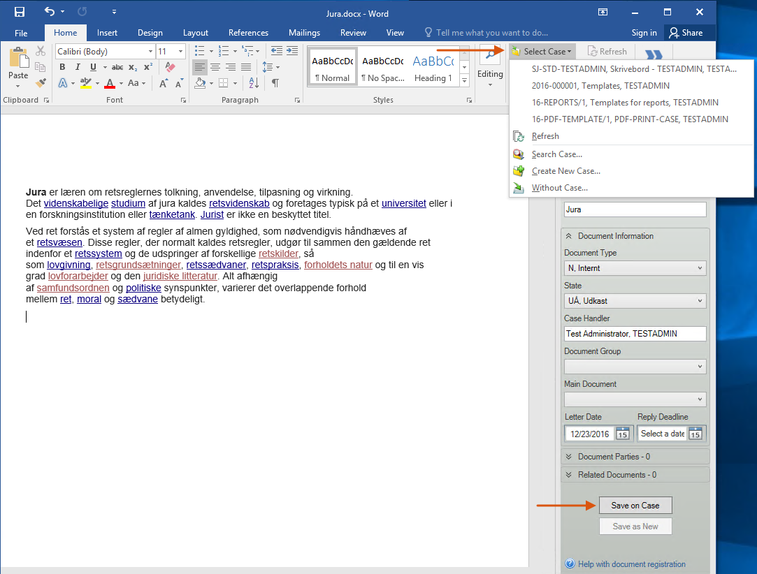 To save a document on a case, you first need to select a case or create a new one. You then register information on the document in the Document Registration pane.