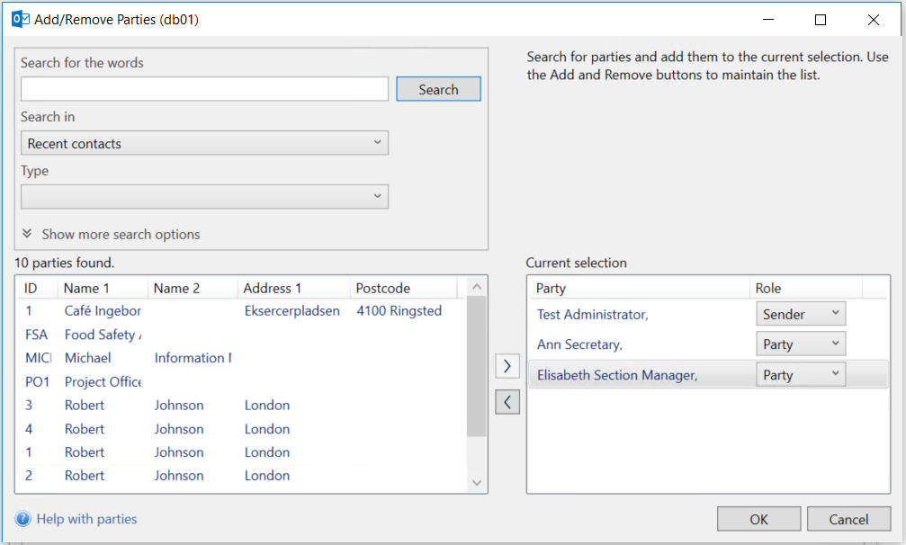 The contacts listed in the To, Cc, and From fields of the saved Outlook item automatically become document parties. Besides that, when you save an Outlook item to a case or create a new case, the system will search for additional matching contacts to use in the registration.