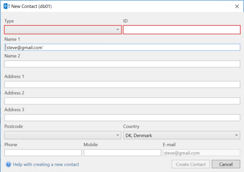 - Click Create New Contact. The New Contact dialog is displayed. The email address field is automatically filled in.