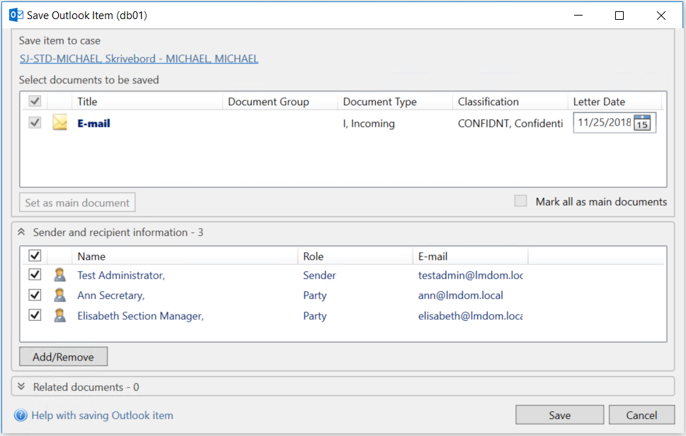 - If the sender or the recipient on an Outlook item can be uniquely matched to a party on the case where you save the Outlook item, the party will be added in the registration dialog as a known contact.