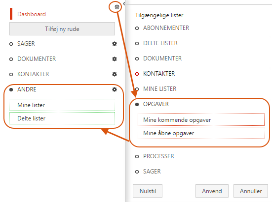- Du kan tilføje flere lister eller ændre rækkefølgen af paneler ved at tilpasse navigationsruden. Du kan for eksempel føje lister med dine Fulgte sager, Læselistesager og Ændrede dokumenter til navigationsruden.