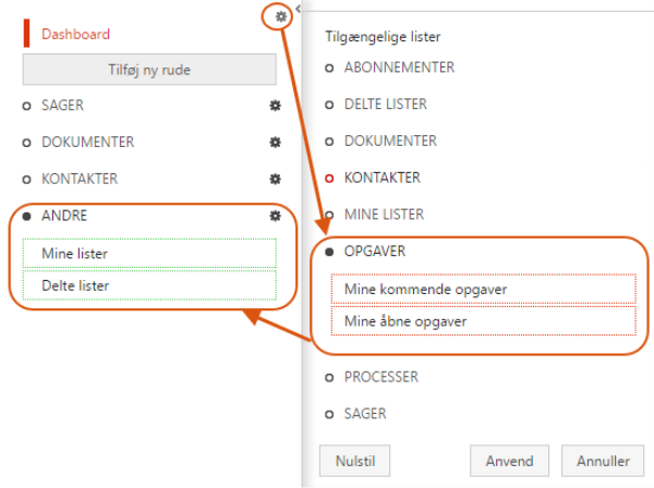 Konfigurer navigation i navigationsruden for at få vist ruden Tilgængelige lister. - Træk listen til den ønskede placering i kolonnen til venstre.